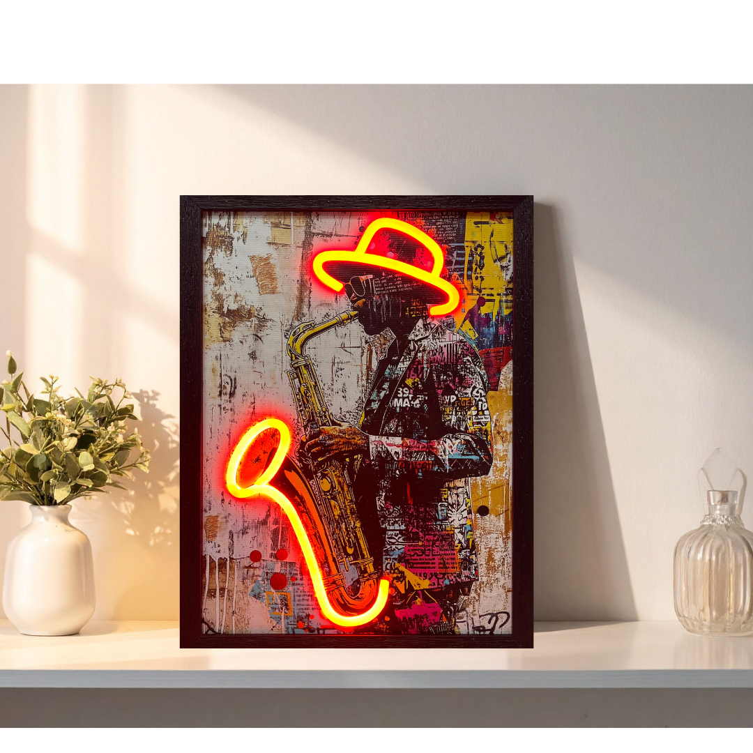 Make a bold statement in your space with this striking LED Neon Framed Wall Art. Featuring a jazz artist, the piece comes to life with a glowing neon red hat and sax effect that instantly catches the eye. Perfect for adding personality and flair to living rooms, bedrooms, bars, or creative spaces.